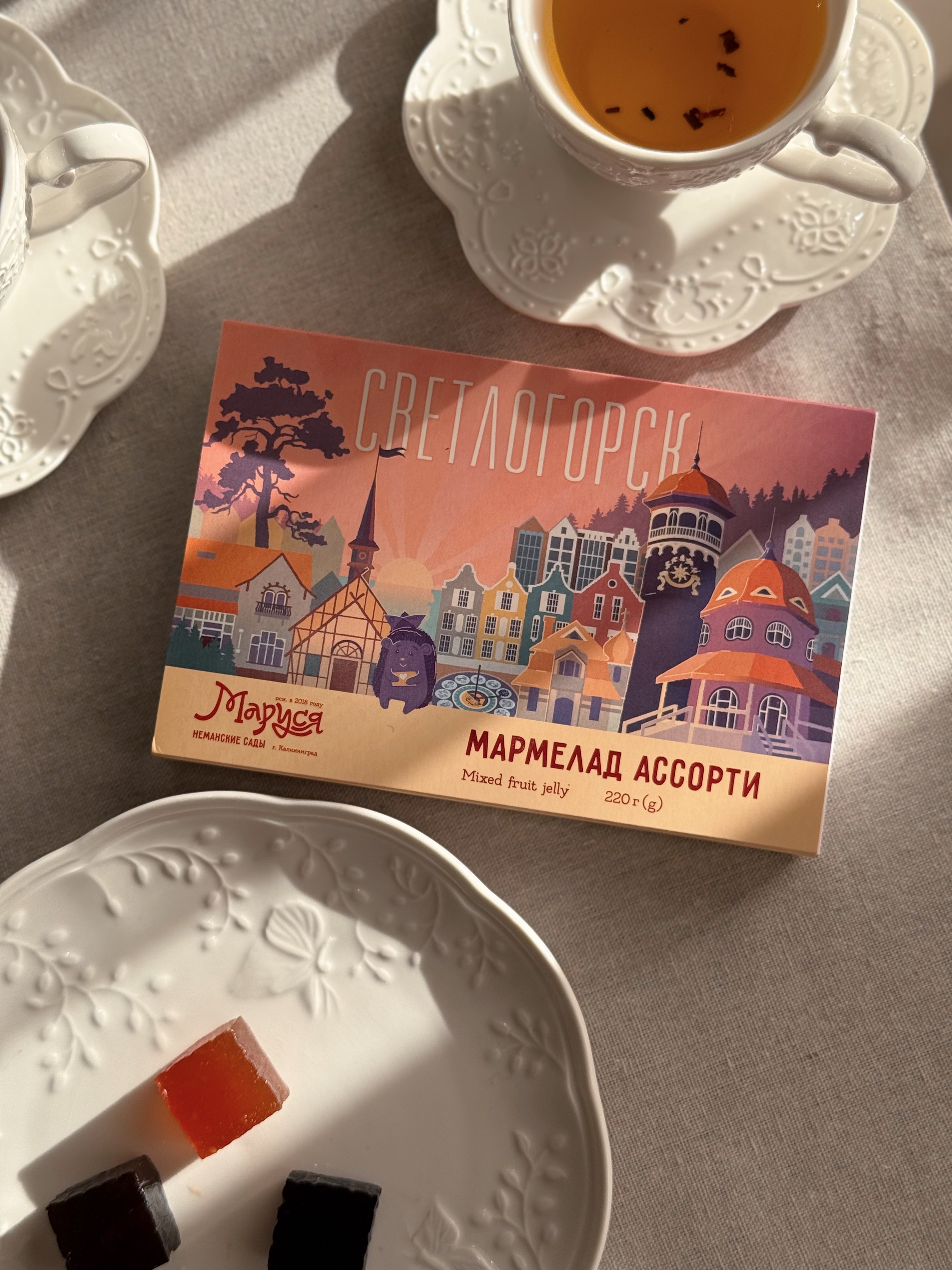 Доступны моно наборы из 8 разных вкусов, а также наборы с 3 вкусами мармелада в красивой упаковке с любимыми достопримечательностями городов области.